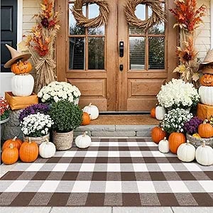 Welcome the cozy charm of autumn to your home with the KIMODE Fall Decor Buffalo Plaid Outdoor Rug. This beautifully woven brown and white checkered rug brings a timeless farmhouse touch to your front porch, entryway, or indoor space