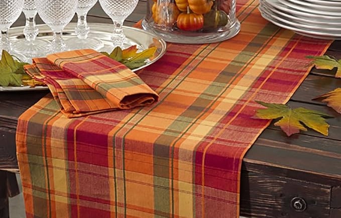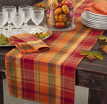Add a cozy, festive touch to your dining space with the Terracotta Orange Holiday Harvest Plaid Cotton Table Runner.